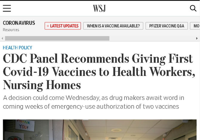 △《華爾街日報》報道,美國CDC專家小組建議給醫(yī)護人員和養(yǎng)老院接種首批新冠疫苗