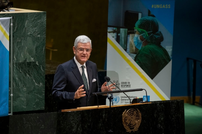 12月3日,第75屆聯(lián)大主席博茲克爾在聯(lián)合國(guó)大會(huì)新冠疫情特別會(huì)議上講話。此次聯(lián)大特別會(huì)議于3日至4日召開(kāi),是聯(lián)合國(guó)大會(huì)首次就大流行病召開(kāi)的特別會(huì)議。古特雷斯在致辭中敦促各國(guó)團(tuán)結(jié)一致、相互支持、協(xié)調(diào)行動(dòng),以抗擊疫情。(新華社發(fā))