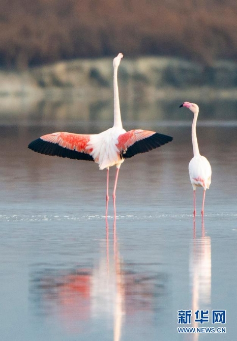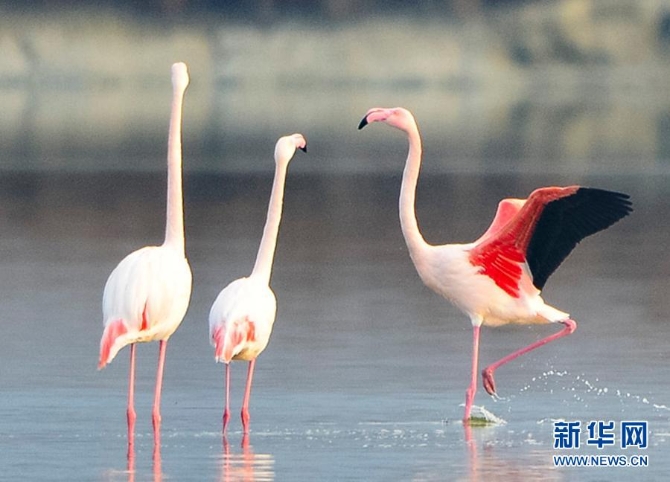 隨著氣溫下降,一些火烈鳥飛抵山西運(yùn)城鹽湖,成為冬日鹽湖一道美麗的風(fēng)景。新華社記者 馬毅敏 攝