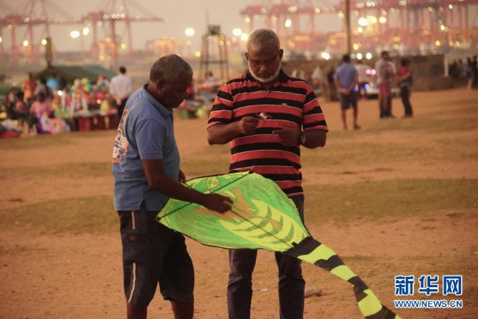 這張拍攝于2019年1月10日的資料照片顯示,納瓦(左)在斯里蘭卡首都科倫坡加勒菲斯綠地廣場上幫助一名游客調(diào)整風(fēng)箏。新華社記者 唐璐/攝