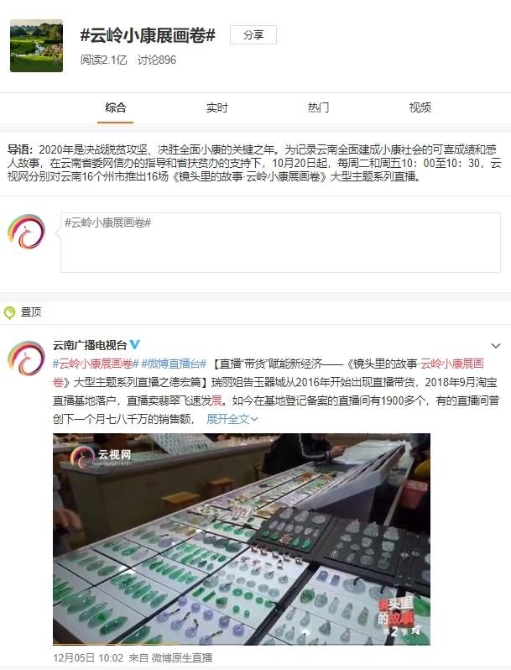 云南省德宏傣族景頗族自治州瑞麗市有"玉出云南·玉從瑞麗"的美譽(yù),是我國(guó)重要的珠寶翡翠集散地之一。12月8日,《鏡頭里的故事·云嶺小康展畫卷》大型主題系列直播走進(jìn)瑞麗姐告玉城,帶網(wǎng)友身臨其境的感受了數(shù)字經(jīng)濟(jì)給珠寶玉石產(chǎn)業(yè)帶來的活力。據(jù)統(tǒng)計(jì),本場(chǎng)直播全網(wǎng)閱讀量782萬(wàn),系列直播全網(wǎng)閱讀量累計(jì)超過2.6億。其中,"云嶺小康展畫卷"微博話題閱讀量累計(jì)超過2.1億。