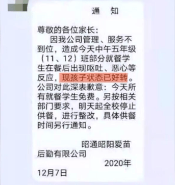 12月7日,昭通昭陽(yáng)愛苗后勤有限公司通報(bào)稱:因該公司管理、服務(wù)不到位,造成當(dāng)天中午五年級(jí)(11、12)班部分就餐學(xué)生在餐后出現(xiàn)嘔吐、惡心等反應(yīng),現(xiàn)孩子狀態(tài)已好轉(zhuǎn)。公司對(duì)此深表歉意:當(dāng)天所有就餐學(xué)生免費(fèi)。