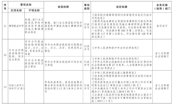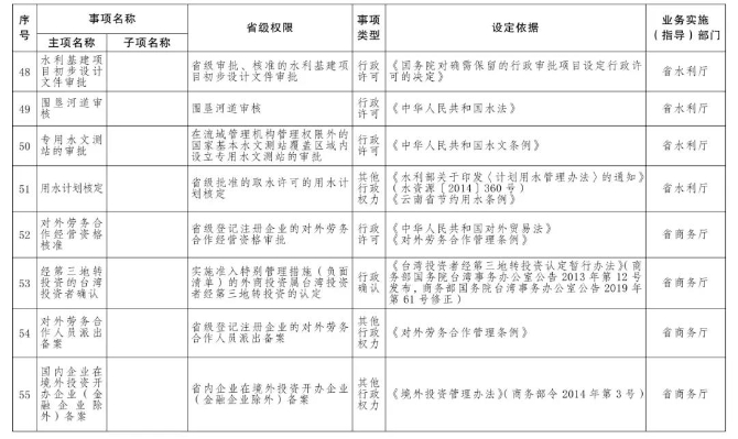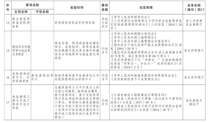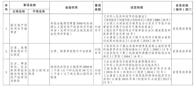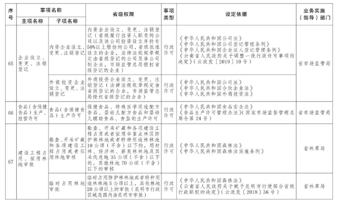 按照《國務院關于印發(fā)6個新設自由貿易試驗區(qū)總體方案的通知》(國發(fā)〔2019〕16號)和《國務院關于同意新設6個自由貿易試驗區(qū)的批復》(國函〔2019〕72號)精神,省人民政府研究決定,向中國(云南)自由貿易試驗區(qū)(以下簡稱云南自貿試驗區(qū))昆明、紅河、德宏片區(qū)管委會下放第一批省級行政權力事項73項,其中行政許可事項55項,行政確認事項2項,其他行政權力事項16項。