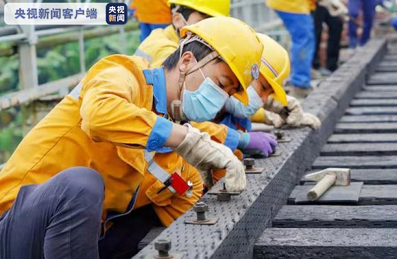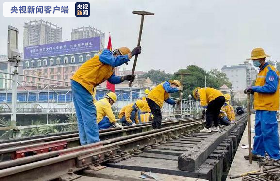 12月9日8時(shí),云南境內(nèi)中越邊境南溪河上,中越鐵路大橋上20余名身穿作業(yè)服、佩戴口罩手套的維修人員在中越鐵路大橋中間,拆開(kāi)橋枕護(hù)木上的螺紋道釘,對(duì)線路高低進(jìn)行調(diào)整。