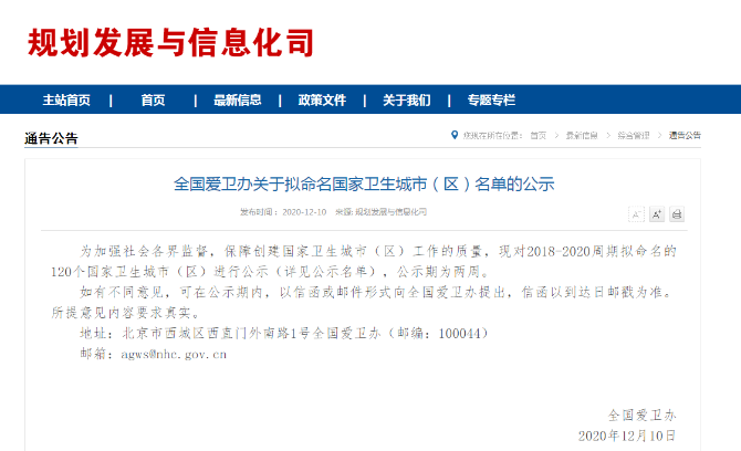 12月10日,國家衛(wèi)健委發(fā)布《全國愛衛(wèi)辦關(guān)于擬命名國家衛(wèi)生城市(區(qū))名單的公示》,對2018-2020周期擬命名的120個國家衛(wèi)生城市(區(qū))進行公示,公示期為兩周。