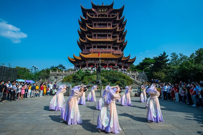 △10月1日,游客在湖北武漢黃鶴樓景區(qū)觀看演出。根據(jù)今年國慶節(jié)、中秋節(jié)假期八天的旅游市場數(shù)據(jù),全國共接待國內(nèi)游客6.37億人次,實現(xiàn)國內(nèi)旅游收入4665.6億元。