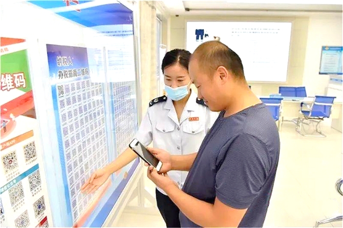 △一名稅務(wù)人員正在幫助納稅人通過手機掃描辦稅,納稅人可隨時隨地辦理各類業(yè)務(wù),實現(xiàn)辦稅“一次也不跑”。