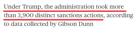日前,多家媒體援引美國格信律師事務(wù)所發(fā)布的統(tǒng)計數(shù)據(jù)顯示,本屆美國政府自2017年上臺以來,已實施超過3900項制裁措施,相當于每天要揮舞3次“制裁大棒”。