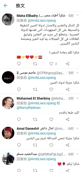 尼羅河國(guó)家電視臺(tái)、“國(guó)家回聲”電視臺(tái)、特別新聞電視臺(tái)對(duì)該活動(dòng)滾動(dòng)直播,《金字塔報(bào)》、《共和國(guó)報(bào)》、《今日埃及人報(bào)》、《七日?qǐng)?bào)》刊文五十余篇,盛贊中國(guó)言必信、行必果;感謝中國(guó)疫苗抵埃,造福埃及人民,為非洲和阿拉伯世界帶來(lái)希望。廖大使推特等使館海外社交媒體相關(guān)內(nèi)容瀏覽量超過(guò)30萬(wàn),點(diǎn)贊量破萬(wàn)。埃網(wǎng)民在廖大使推特賬號(hào)上留言,表示“患難見(jiàn)真情”,偉大的中國(guó)人民在困難面前始終與埃及站在一起,這是真朋友的體現(xiàn),“埃中友誼萬(wàn)歲”。(中國(guó)駐埃及大使館網(wǎng)站)