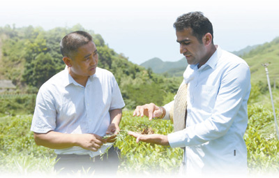 6月30日,在陜西省漢中市鎮(zhèn)巴縣三元鎮(zhèn)興順農(nóng)牧業(yè)有限責(zé)任公司的茶園里,金樂天(右)和公司負(fù)責(zé)人馬忠華進(jìn)行交流。新華社記者 李一博攝