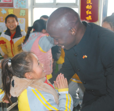 杜牧同為陜西省合陽縣坊鎮(zhèn)中心小學(xué)五年級學(xué)生作中非國別文化報(bào)告,課后與小學(xué)生互動交流。資料圖片