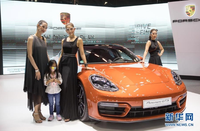 12月13日,一個(gè)小女孩在泰國(guó)曼谷舉辦的第37屆泰國(guó)國(guó)際汽車博覽會(huì)上與車模合影。新華社記者 張可任/攝