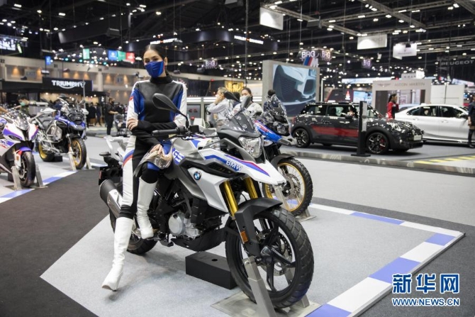 12月13日,一名車模在泰國(guó)曼谷舉辦的第37屆泰國(guó)國(guó)際汽車博覽會(huì)上展示摩托車。新華社記者 張可任/攝
