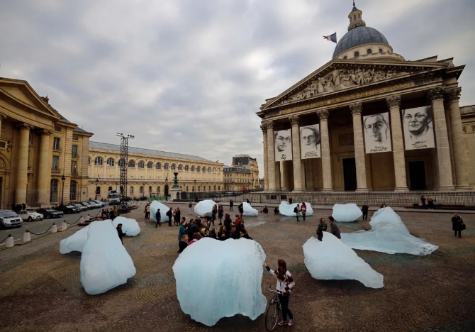 △當(dāng)?shù)貢r(shí)間2015年12月3日,巴黎氣候大會期間,藝術(shù)家將從格陵蘭島運(yùn)來的冰塊放置在先賢祠前,打造了名為“看冰”的藝術(shù)作品(圖片來源:視覺中國)
