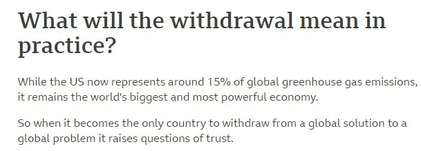 △英國廣播公司網(wǎng)站發(fā)表的一篇文章稱,美國排放的溫室氣體占全球排放量的15%,其退出《巴黎協(xié)定》給全球減排事業(yè)造成了“信任問題”(圖片來源:英國廣播公司網(wǎng)站截圖)