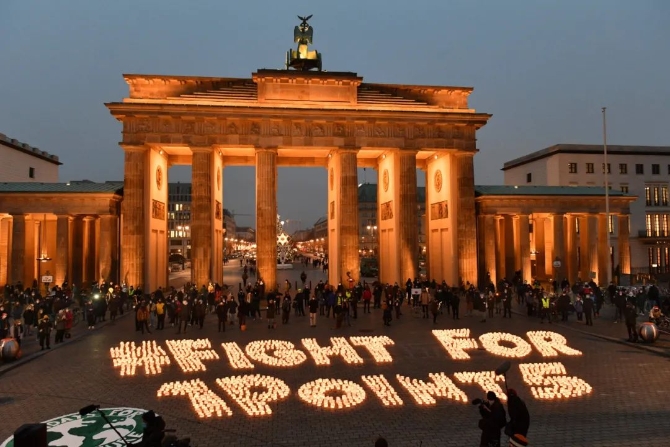 △當(dāng)?shù)貢r(shí)間2020年12月11日,支持積極應(yīng)對氣候變化的人士在柏林勃蘭登堡門前點(diǎn)燃蠟燭,拼出“為1.5攝氏度而戰(zhàn)”的口號(圖片來源:視覺中國)