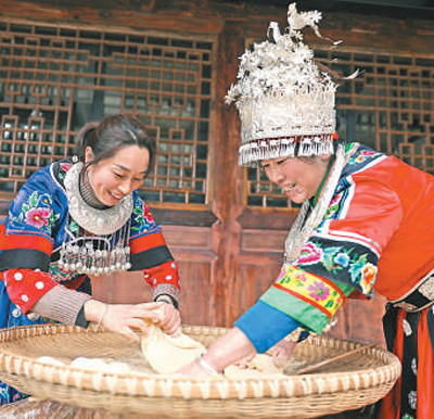 村民們在準(zhǔn)備糯米糍粑招待客人。 |