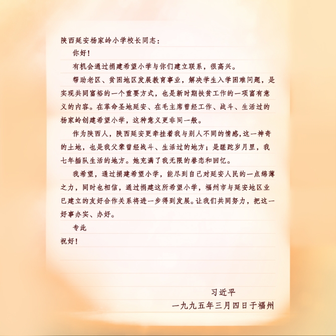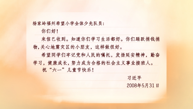 2008年5月21日,楊家?guī)X福州希望小學(xué)的孩子們給時任國家副主席的習(xí)近平寫信,匯報(bào)他們向汶川災(zāi)區(qū)小朋友捐款捐物和自己日常學(xué)習(xí)生活情況。10天后,他們收到了回信。信中,習(xí)近平勉勵他們發(fā)揚(yáng)延安精神,勤奮學(xué)習(xí),健康成長,努力成為社會主義事業(yè)接班人。