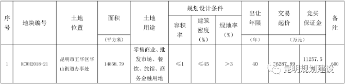 此宗土地編號為KCWH2018-21號地塊,地塊性質(zhì)為零售商業(yè)、批發(fā)市場、餐飲、旅館、商務(wù)金融用地,面積約22.29畝,容積率≤1,建筑密度≤45%,綠地率>3%,交易起價(jià)56287.89萬元,競價(jià)階梯為600萬元,起始土地單價(jià)約2525.46萬元/畝。
