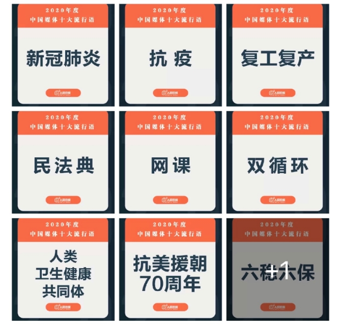 近日,“2020年度中國媒體十大流行語”如期出爐,依次為:新冠肺炎、抗疫、復(fù)工復(fù)產(chǎn)、民法典、網(wǎng)課、雙循環(huán)、人類衛(wèi)生健康共同體、抗美援朝70周年、“六穩(wěn)”“六?!薄㈡隙鹞逄?。令人矚目的是,十大流行語里,與新冠肺炎疫情相關(guān)的詞匯多達(dá)7個(gè)。這既是對全年重點(diǎn)事件的忠實(shí)盤點(diǎn),也從一個(gè)側(cè)面記錄了中國上下抗擊疫情的非凡歷程。