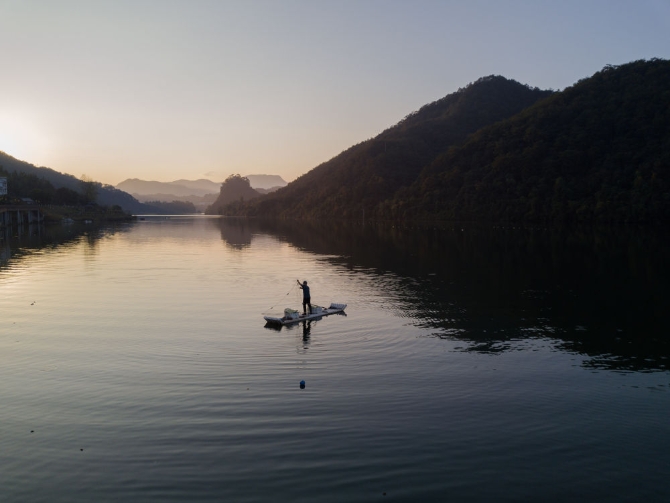 福建省三明市將樂縣高唐鎮(zhèn)常口村村民在村口的金溪上捕魚(11月20日攝,無人機照片)。新華社記者 宋為偉 攝