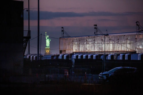 12月14日,在美國紐約,用于存放新冠患者遺體的冷藏車停放在一處臨時停尸場。新華社發(fā)(郭克 攝)