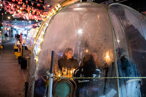 12月14日,在美國紐約,人們在一家餐廳的室外就餐區(qū)就餐。新華社發(fā)(郭克攝)