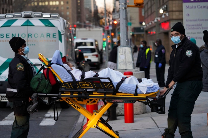 12月8日,醫(yī)護(hù)人員在美國紐約一家醫(yī)院外運送病人。新華社記者王迎/攝