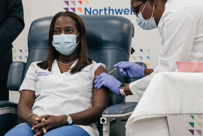 12月14日,在紐約長島猶太醫(yī)療中心,重癥監(jiān)護(hù)室護(hù)士桑德拉·琳賽(左)接種新冠疫苗。新華社發(fā)(紐約州州長辦公室供圖)