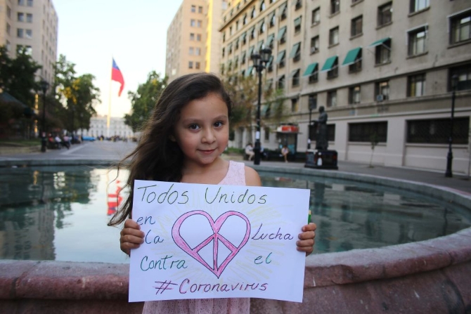 2月10日,在智利首都圣地亞哥,5歲的女孩達(dá)娜·蘇亞雷斯展示畫作。她在這幅畫上寫道:“我們團(tuán)結(jié)起來抗擊冠狀病毒!” 新華社發(fā)