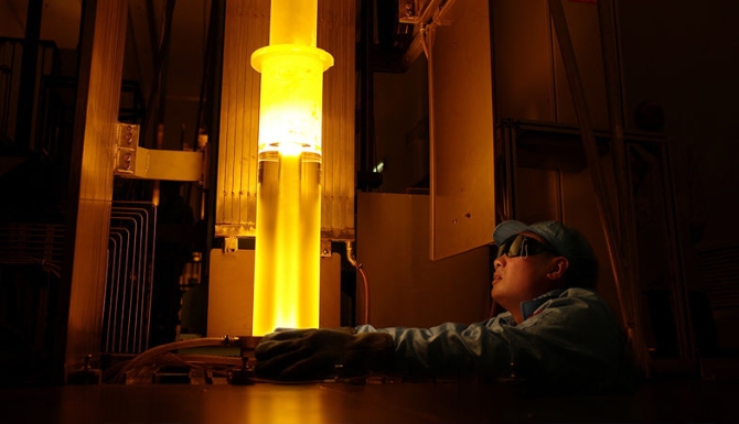 走進(jìn)位于江蘇省蘇州市吳江區(qū)的亨通集團(tuán)產(chǎn)品展示區(qū),一根直徑200毫米、長度6米的光纖預(yù)制棒引人注目。工作人員告訴記者,這根自主研發(fā)的超大尺寸光纖預(yù)制棒可連續(xù)拉絲6天,拉絲長度達(dá)15000公里。