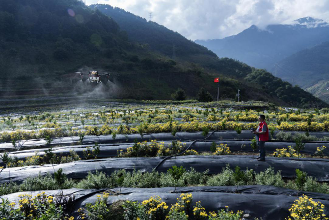 ▲怒江州瀘水市多多農(nóng)園帶頭人左雪峰變身飛手,使用無(wú)人機(jī)噴藥, 300畝橘園幾天就能完成標(biāo)準(zhǔn)化噴藥工作,這一基地的智慧農(nóng)業(yè)系統(tǒng)由趙春江院士團(tuán)隊(duì)與拼多多聯(lián)合建設(shè)。(攝影:穆功)