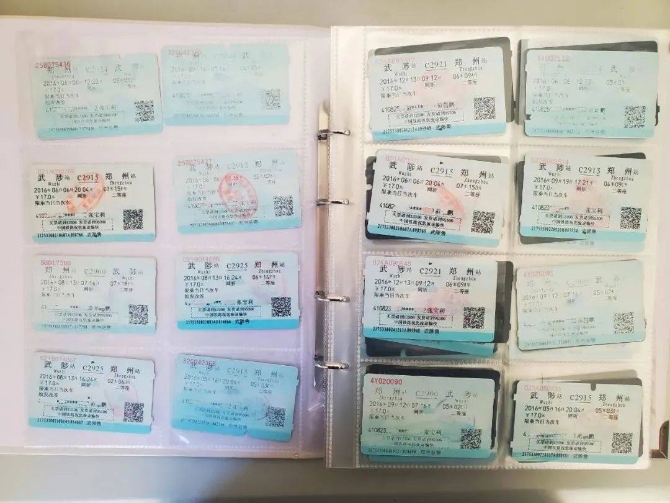 今年是范鵬鵬和妻子結(jié)婚的第四年。范鵬鵬數(shù)了數(shù)這些年他們往返鄭州、武陟的火車票,一共216張。每一張都藏著滿滿的回憶。
