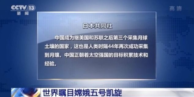 日本共同社報(bào)道說,中國(guó)成為繼美國(guó)和蘇聯(lián)之后第三個(gè)采集月球土壤的國(guó)家,這也是人類時(shí)隔44年再次成功采集到月壤。中國(guó)正朝著太空強(qiáng)國(guó)的目標(biāo)積累技術(shù)和經(jīng)驗(yàn)。