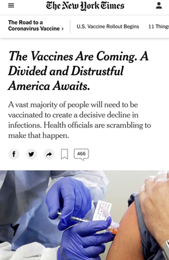 美國(guó)本周開(kāi)始了首批疫苗接種,這本該是讓人看到希望的事情,卻因人們對(duì)美國(guó)政府長(zhǎng)期不作為的失望與不信任,導(dǎo)致了新的質(zhì)疑和恐懼?!都~約時(shí)報(bào)》此前就報(bào)道稱(chēng),疫苗的到來(lái)將加深美國(guó)社會(huì)的分裂與矛盾。
