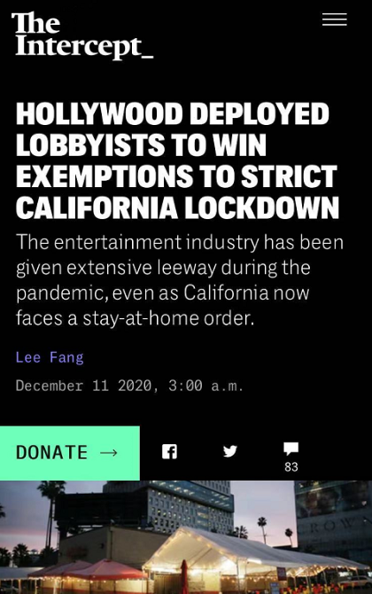 然而,目前全美仍有大量官員和民眾無(wú)視風(fēng)險(xiǎn)。近日,網(wǎng)絡(luò)媒體《攔截》的一篇報(bào)道指出,盡管美國(guó)各地再次施行宵禁,但一些大企業(yè)卻通過(guò)游說(shuō)政客等方式,使自己免受防疫措施的限制。