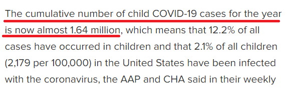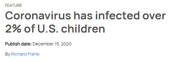美國(guó)兒科學(xué)會(huì)和兒童醫(yī)院協(xié)會(huì)聯(lián)合發(fā)布的最新報(bào)告顯示,美國(guó)已有近164萬(wàn)名兒童確診感染,占到了全美兒童總數(shù)的2%。此外,截至12月10日的一周內(nèi)新增兒童確診病例近18萬(wàn)例,創(chuàng)疫情暴發(fā)以來(lái)單周最高紀(jì)錄。