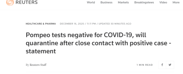 當(dāng)?shù)貢r(shí)間16日,美國(guó)國(guó)務(wù)卿蓬佩奧在與新冠病毒檢測(cè)呈陽(yáng)性者接觸后進(jìn)入隔離,目前尚不清楚他是何時(shí)何地接觸到這名新冠肺炎患者的。