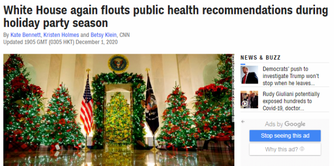 更為荒謬的是,美國(guó)有線電視新聞網(wǎng)(CNN)報(bào)道指出,在全美疫情持續(xù)失控的情況下,即將卸任的特朗普政府卻啟動(dòng)了“假日派對(duì)季”,不僅無(wú)視美國(guó)疾控中心對(duì)聚會(huì)規(guī)模的限制,也無(wú)視首都華盛頓的防疫要求。