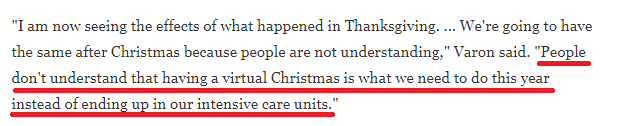 休斯頓聯(lián)合紀(jì)念醫(yī)療中心重癥監(jiān)護(hù)主任在接受美國(guó)公共電臺(tái)(NPR)采訪時(shí)說(shuō),他已連續(xù)工作272天,從未間斷。他對(duì)人們正放松警惕感到絕望,因?yàn)樗麚?dān)心圣誕節(jié)后感染數(shù)字可能會(huì)激增。他提醒人們,現(xiàn)在需要過(guò)一個(gè)全力應(yīng)對(duì)病毒的圣誕節(jié),不然很可能會(huì)在重癥監(jiān)護(hù)室里迎接新年。