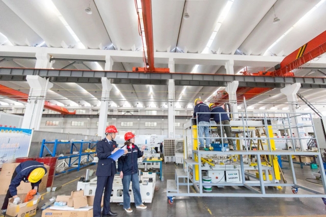 △2020年10月10日,在江蘇南通如皋市瀚皋機(jī)械設(shè)備有限公司生產(chǎn)車間內(nèi),稅務(wù)局工作人員在對出口產(chǎn)品訂單量及生產(chǎn)情況進(jìn)行實(shí)地了解。