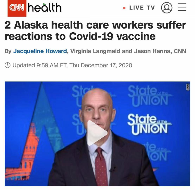 △CNN18日報道,阿拉斯加州出現(xiàn)第三例醫(yī)護人員接種疫苗后產(chǎn)生不良反應(yīng)案例