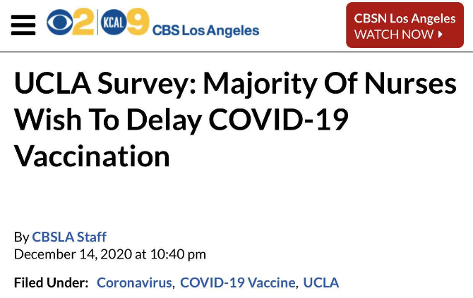 美國加州大學洛杉磯分校對當?shù)蒯t(yī)護人員進行調(diào)查后發(fā)現(xiàn),許多醫(yī)護人員對疫苗持保留態(tài)度。三分之二醫(yī)護人員希望推遲疫苗接種或不愿接種;超過半數(shù)則認為,聯(lián)邦政府施壓導致了疫苗研發(fā)過于倉促,使得他們對疫苗的信任度大打折扣。