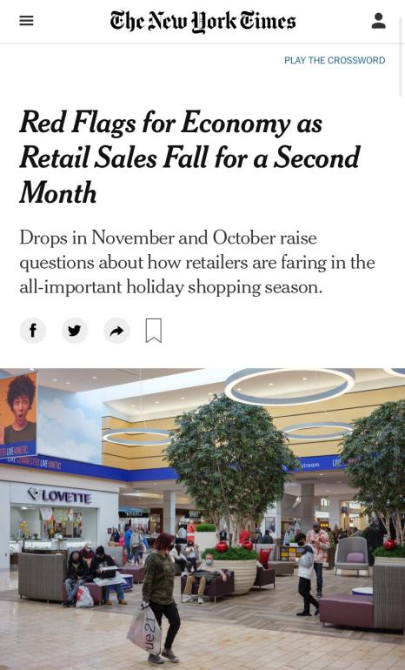 △《紐約時(shí)報(bào)》報(bào)道,美國11月零售額下滑1.1%,為經(jīng)濟(jì)復(fù)蘇敲響警鐘