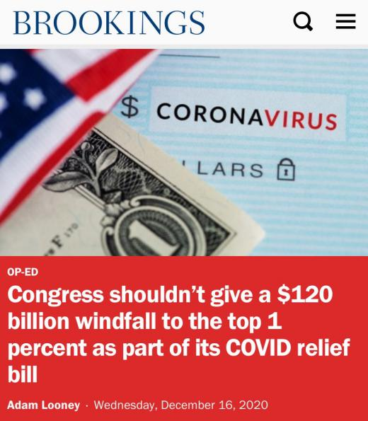 △布魯金斯學(xué)會認(rèn)為,美國國會即將出臺的新一輪紓困措施,可能包含1200億美元送給富人的“禮物”