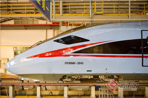 此次入滇的CR300AF型復(fù)興號是“復(fù)興號”中國標(biāo)準(zhǔn)動車組體系中的新車型。該車型動車組時速為250公里/小時,外觀呈淡藍(lán)色,具有運行品質(zhì)平穩(wěn)舒適、乘坐環(huán)境寬敞明亮、列車噪音低、振動小等高舒適度;以及安全可靠、高智能化、運能強大、節(jié)能環(huán)保、完全自主等特點,在風(fēng)、沙、雨、雪等惡劣天氣條件下也能正常運行。