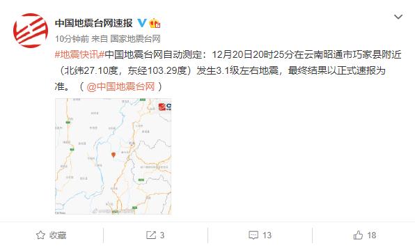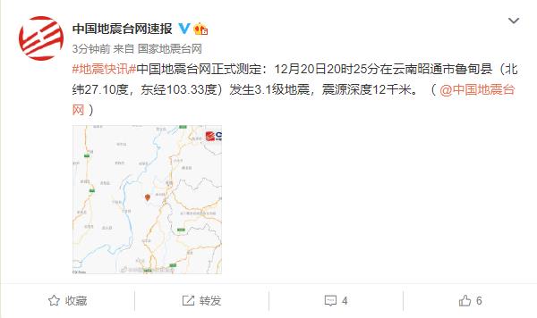 昆明信息港訊 據(jù)中國地震臺網(wǎng)正式測定:12月20日20時25分在云南昭通市魯?shù)榭h(北緯27.10度,東經(jīng)103.33度)發(fā)生3.1級地震,震源深度12千米。