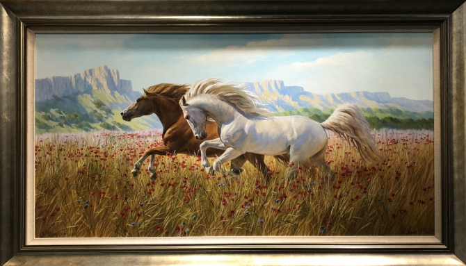 在第25屆秋季廣州國際藝術博覽會現(xiàn)場俄羅斯主題館,兩匹馬兒一棕一白,正馳騁草原,翻越崇山。這是一幅來自烏克蘭藝術家的油畫。