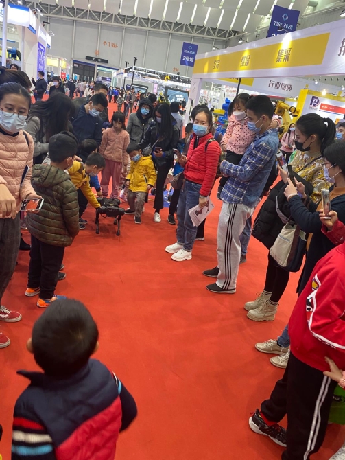 在廣東佛山國際智能機器人博覽會現(xiàn)場,一群孩子正在家長的陪同下追著會場內的智能機器狗奔跑。展會現(xiàn)場人氣旺盛。