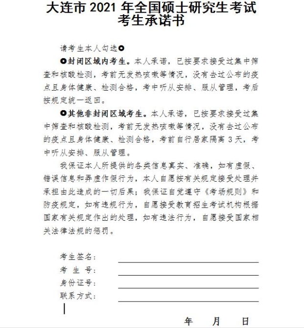 考生須持《準(zhǔn)考證》、《居民身份證》、核酸檢測陰性報(bào)告及“遼事通健康通行碼”綠碼,經(jīng)測溫合格后方可進(jìn)入考點(diǎn)。 同時(shí),封閉區(qū)域內(nèi)考生還須提交《本人承諾書》,承諾本人接受過集中篩查和核酸檢測,考前無發(fā)熱咳嗽等情況,沒有去過公布的疫點(diǎn)且身體健康、檢測合格,考中聽從安排、服從管理,考后按規(guī)定統(tǒng)一返回。